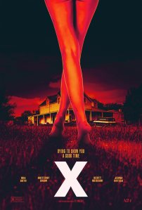 Writer/Director Ti West’s X is a knowing and fun tribute to low budget horror films of the 1970’s. The obvious touch point is The Texas Chainsaw Massacre which it seems to emulate for quite a few of its early scenes. But the film specifically cites Psycho as well in a conversation between its main characters about a film pivoting its plot line mid movie, which of course is what happens here. And The Shining fans should also look out for a scene involving a hatchet and a door.